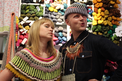 Stephen West ja kurssille osallistunut Saila Soininen poseeraavat brioche-neuleissa