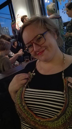 Kurssipäivänä kaivoin kassistani pöydälle Laikan isoäidiltään saaman ketjun, käsinkehräämääni lankaa, neuleystävän värjäämää ihkulankaa sekä kasan epämääräisiä jämäkeriä. Kun kerroin, mitä olen tuonut mukanani, Stephen totesi: "Today we will knit our grandmothers proud!", mikä sai kyyneleet silmiini. Ja uskon, että mamma on ylpeä pojantyttärestään, joka lähes 30 neulontavuoden jälkeen uskalsi hypätä kohti tuntematonta ja tehdä jotain, mitä ei olisi ehkä koskaan oma-alotteisesti tullut tehneeksi. Rakastan tekemässäni korussa sitä, että siihen liittyy niin paljon hyviä muistoja. Ihana neuleyhteisö, rakas mammani, vaimo, joka saa korun joululahjaksi (itse halusi!), sekä tuo loistava työpaja, jossa nauru herskyi ja ideat kimpoilivat.