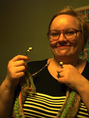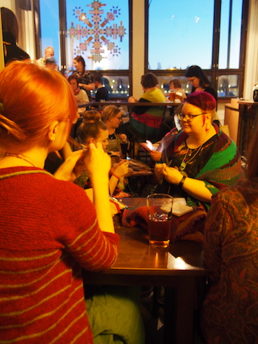 Musiikki soi, virvokkeet virtaavat ja lanka juoksee jokaisessa tunnelmallisen baarin pöydässä. Ravintola 931 Tampereella on tämän lauantai-illan ajan joka neulojan unelma. Paikalla ei suinkaan ole pelkkiä tamperelaisia, vaan myös tämän hetken kuumimpiin neulesuunnittelijanimiin kuuluvat Stephen West ja Ysolda Teague, sekä heidän fanejaan ympäri Suomen. Ruoan lisäksi tarjolla on Titityyn ja Lankakauppa Kerän lankaherkkuja. Silmänruokaa tarjoavat Westin ja Teaguen ohjeiden alkuperäisneuleet, joita on ripoteltu sinne tänne – niin seinille kuin pöydille.
