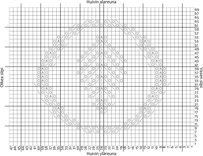 Kaaviossa 1 on esitetty oikean puolen kerrokset. Nurjan puolen kerrokset neulotaan seuraavasti: 1 n, 3 o, 39 n, 3 o, 1 n. Neliö neulotaan yläreunasta alareunaan.