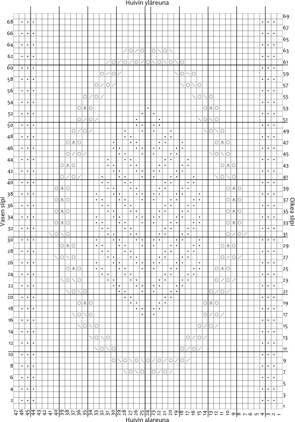 Luo kahdelle koon 3,5 mm puikoille 47 s. Vaihda työhön 4,5 mm puikot. Neulo 7 krs oikein. Aloita kaavio 1 tai 2 oikean puolen krs:lta 1. Kaaviossa 1 nurjan puolen kerrokset neulotaan aina seuraavasti: 1 n, 3 o, 39 n, 3 o, 1 n.