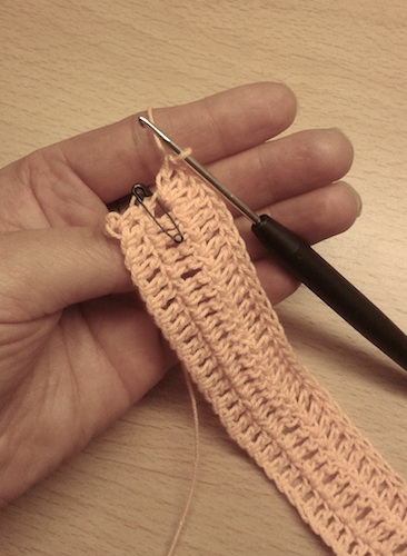 Kun olet neulonut verkkoneuletta n. 10 krs, siirrä silmukat pyöröpuikolle. Merkitse kerroksen alkamiskohta silmukkamerkillä.