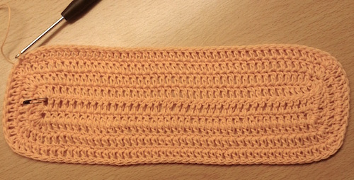 4. krs: Jatka tästä virkkausta eteenpäin työn lyhyelle sivulle. Halutessasi merkitse kulmaan kerroksen alku silmukkamerkillä (tai hakaneulalla). Virkkaa lyhyelle sivulle 4 p ja kulmaan 3 p samaan pylvääseen. Virkkaa 1 p jokaiseen pylvääseen seuraavaan kulmaan asti ja toista sama kuin toisessa päässä. Virkkaa kerros loppuun 1 p jokaiseen edellisen kerroksen pylvääseen.