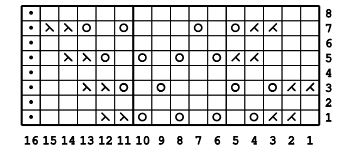 Jatka kierrettyä joustinneuletta molemmissa reunoissa 5 silmukalla. Neulo niiden välissä pitsineuletta kaavion mukaan yhteensä 30 mallikerran verran eli noin 100 cm. Huom. Voit lisätä merkkilangan kaitaleen oikeaan reunaan, kun olet neulonut 21 kokonaista mallikertaa ja vielä 2 krs seuraavasta mallikerrasta. Tässä on toisen kaitaleen silmukoiden poimimisen päättymiskohta D.