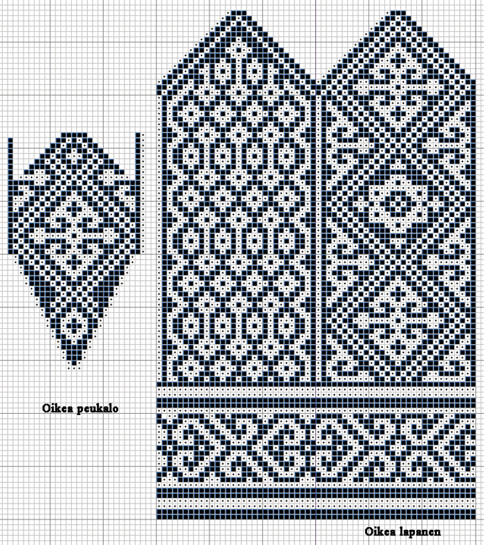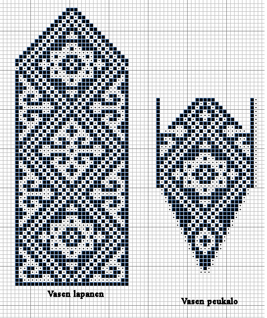 Kaavioihin on merkitty kämmenselän kuviot ("oikea lapanen" ja "vasen lapanen") ja vastaavat peukalot ("oikea peukalo" ja "vasen peukalo"). Neulo vasemman lapasen kämmenselän kuvio samoin kuin oikeassa lapasessakin, ts. korvaa oikean lapasen kämmenselän kaavio vasemman lapasen kämmenselän kaaviolla.