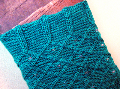 Luo 80 silmukkaa sukkapuikoille ja yhdistä pyöröneuleeksi. Varo, etteivät silmukat kierry. Voit vaihtaa kerroksen ensimmäisen ja viimeisen silmukan paikkaa keskenään, niin kerroksen vaihtumiskohtaan ei tule pykälää. Neulo 1 o, 1 n -joustinneuletta 3 cm ja aloita mallineule kaavion 1 mukaan 1. riviltä. Punainen alue osoittaa toistettavan 10 silmukan mallikerran. Sijoita mallikuvion ensimmäinen palmikonkierto siten, että joustinneuleen oikea silmukka tulee päälle. Varteen tulee kahdeksan timanttikuviota. Helmet tulevat 6. kerroksella kahden silmukan väliin. Kerroksen vaihtumiskohdassa kuviossa voi esiintyä hieman epäjatkuvuutta, mutta pyri siihen, että mallikuvio toistuu muodoltaan oikein koko ajan. Toista kaavion 1 kerroksia 1 - 10 neljä kertaa, neulo sitten vielä kerrokset 1 - 5 ja aloita kantapää.