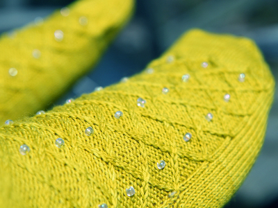 Neulo vasen sukka samoin kuin oikea. Muista pujottaa loput helmet lankaan ennen aloittamista.