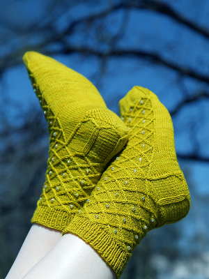 Taito-lehdestä otettiin taannoin yhteyttä Ullaan ja kysyttiin kiinnostusta suunnitella sukkamalleja Ulla-jutun yhteyteen. Heikkona hetkenäni lupauduin mukaan, mutta kun deadline läheni, neuloin vain jotain muuta eikä päässäni ollut yhtään ideaa. Olinkin jo perua koko homman, mutta niin kuin useasti kohdallani tapahtuu, niin nytkin, kun aikaa oli oikeastaan jäljellä liian vähän, idea ilmestyi jostain. Tässä on tulos: vinoneliökuvioset, keväänvihreät, helmikuvioiset juhlasukat. Nimi sukkiin tuli vinoneliön englanninkielisestä nimestä, joka taas on kreikkaa ja tarkoittaa pyörivää esinettä. Nimi on aika osuva sikäli, että intensiivisen neulontasession jälkeen pää oli aika pyörällä.