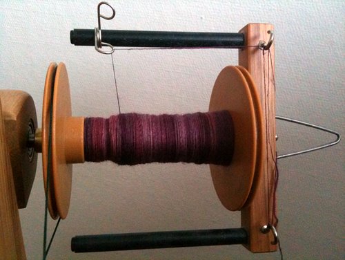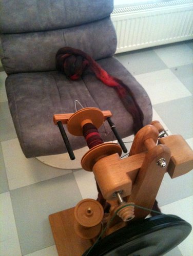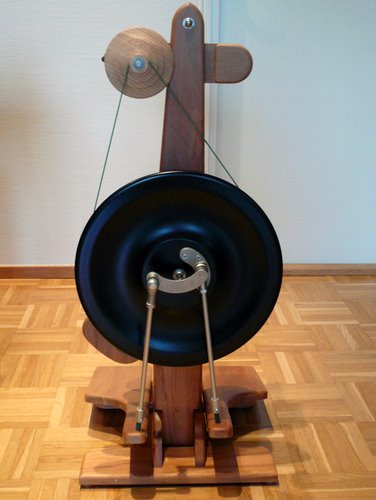 Muina lisäosina tilasin Majacraftin oman jarrullisen rullatuolin sekä rukkiin kiinnitettävät vyyhdinpuut, joita voi joko polkea tai pyörittää käsin. Vyyhdinpuut ovat osoittautuneet käteviksi paitsi kehruussa myös vyyhdittäessä purkulankaa pesua ja suoristusta varten, sillä työt voi purkaa suoraan vyyhdille: mies pitää purettavasta työstä kiinni ja minä poljen siitä lankaa suoraan vyyhdinpuille. Se on nopeaa ja tehokasta. Käsin pyörittäessä ja omaa kehruuta vyyhdittäessä taas voi samalla laskea kierrokset, jolloin saa langan pituuden laskettua samalla. Vyyhtikokoa voi säätää mieleisekseen.