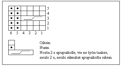 12. krs: *Neulo 6 o, 1 o etu- ja takareunastaan*, toista *-* koko kerroksen ajan (64 s).