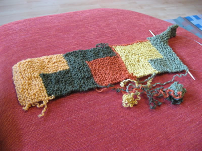 Ala sitten neuloa seuraavaa suikaletta: luo puolet tilkkuun tarvittavista silmukoista ja poimi sitten ensimmäisen tilkun oikeasta laidasta loput silmukat niin, että valmiin tilkun oikea puoli on itseesi päin. Poimi ensin keskimmäinen silmukka aivan laidasta ja sitten jokaisen nostetun silmukan alta yksi uusi silmukka. Kun pääset ensimmäisen tilkun reunaan, pitäisi silmukoita olla taas oikea määrä.