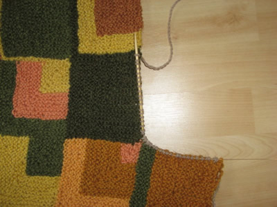 Kun jäljellä on 1 silmukka, luo toisen tilkun silmukat. Edellisen tilkun viimeinen silmukka on samalla uuden tilkun ensimmäinen. Jätä se puikolle ja ala poimia tilkun reunasta silmukoita siten, että poimit jokaisen nostetun silmukan alta yhden uuden silmukan. Pidä tällöin tilkku oikea puoli itseesi päin. Nyt silmukoita pitäisi olla puolet tarvittavasta määrästä, omassa peitossani 20. Poimi tilkun nurkasta yksi silmukka ja luo sitten loput silmukat. Neulo toinen tilkku samoin kuin ensimmäinen - keskimmäinen silmukka on viimeinen, jonka poimit edellisen tilkun laidasta.