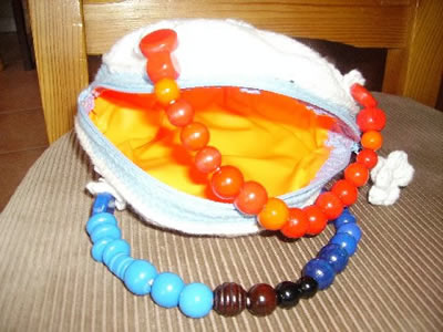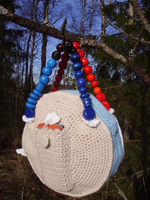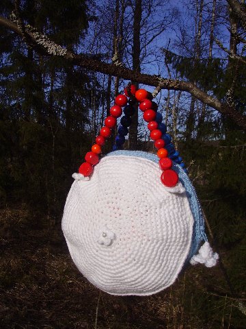 Puuvillaisista jämälangoista tehty käsilaukku. Idea syntyi erivärisistä ja -muotoisista puuhelmistä, joita oli kertynyt laatikon pohjalle.