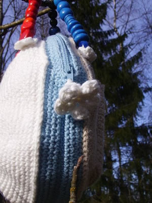 Vaihda sininen lanka. Virkkaa edell. krs:n (19. krs:n) s:jen takareunoihin aina 1 s jokaiseen s:aan krs loppuun. Virkkaa vielä 2 krs ks:oita sinisellä. Ota nyt koukulle normaalisti s:jen molemmat reunat. Virkkaa seuraava krs samoin, mutta käänny, kun krs:ta on virkkaamatta 25 cm (= vetoketjuaukko).