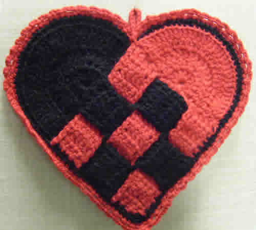 Sydänpatalappu virkataan kahdessa osassa ja lopuksi reunuksella yhdistetään osat toisiinsa.
