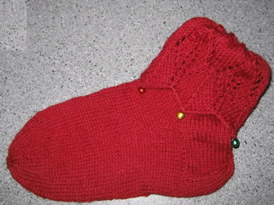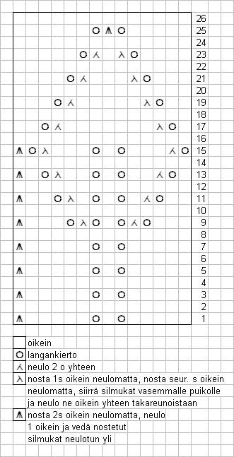 Joulu vaatii koristeita ja kulkusia, miksei siis myös sukissa! Lanka ja langan menekkiNovita Nalle, 150 g, tummanpunainen Neuletiheys23 s ja 34 krs sileää neuletta = 10 cm PuikotSukkapuikot, 2,5 ja 3 mm tai käsialan mukaan Muut tarvikkeet5 pientä kulkusta KokoKengännumero 39 OhjeLuo 70 silmukkaa paksummilla puikoilla ja neulo kuviopiirroksen mukaan. Kuvion päätyttyä neulo vielä neljä kerrosta sileää neuletta. Viimeisellä kerroksella kavenna tasavälein 14 s (=56 s). Käännä työ nurja puoli päällepäin ja aloita neulomaan pienemmillä puikoilla 2 o, 2 n -joustinneuletta. Neulo joustinta 28 kerrosta. Vaihda isommat puikot ja neulo sileää neuletta neljä kerrosta. Tee kantapää 1. ja 4. puikon silmukoilla. Neulo 4. puikon jatkoksi 1. puikon s:t, neulo ne oikein. Jätä muut s:t odottamaan. Käännä työ. 1.krs: (nurja puoli) nosta 1. s nurin neulomatta, neulo muut s:t nurin. Käännä työ. 2. krs: (oikea puoli) nosta 1. silmukka oikein neulomatta, neulo muut s:t oikein. Toista 1.-2. krs:ia, kunnes kantapäässä on 30 kerrosta. Neulo 18 s nurin ja *neulo 2 s nurin yhteen, käänny, nosta 1. s neulomatta, neulo 8 o, neulo 2 s takareunastaan yhteen, käänny, neulo 9 s nurin*, toista *-* kunnes kaikki reunasilmukat on kavennettu. Poimi kantapään reunasta 15 s ja neulo nostetut s:t kiertäen oikein 1. puikolle. Neulo 2. ja 3. puikon s:t oikein. Poimi 4. puikolle toisesta reunasta 15 s. Neulo 4. puikon s:t kiertäen oikein. 1. ja 4. puikolla on nyt 20 s molemmilla. Jatka suljettuna neuleena sileää neuletta ja tee kiilakavennukset seuraavasti: neulo 1. puikon lopussa 2 oikein yhteen ja neulo 4. puikon alussa 2 s ylivetäen yhteen. Neulo 1 krs ilman kavennuksia. Tee kavennuskrs kuten edellä, 2 krs, kavennuskrs, 3 krs. Jatka tähän tapaan, kunnes joka puikolla on taas 14 s. Neulo sileää kunnes olet pikkuvarpaan kärjessä. Neulo kärjen ensimmäinen kavennuskerros *4 o ja 2 o yhteen*, toista *-*, 2 o. Neulo 4 krs sileää, *3 o ja 2 o yhteen*, toista *-*, 2 o, neulo 3 krs ja jatka näin kunnes olet neulonut koko kerroksen 2 o yhteen. Katkaise lanka ja vedä silmukoiden läpi. Päättele langat, kastele ja pingota sukat (erityisesti varsi) ja ompele kulkuset varren sakaroiden päihin. Kaavio