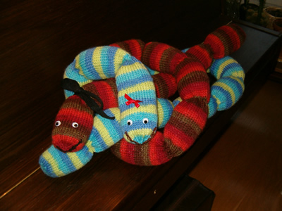 Santtu-käärme (Serpentes santucus) on kiltti, leikkisä ja pehmoinen matelija. Raidoitukseltaan se muistuttaa merikäärmeitä, mutta poikkeuksena muista käärmeistä siinä on tasaisin välein esiintyviä pallukoita. Santtu-käärme ei vaivu talvihorrokseen, vaan se pysyy eloisana läpi vuoden eikä säikähdä pakkasilmaakaan. Santtu on hyvin vähäruokainen, mutta luikertelee mielellään lankakerien joukossa etsimässä makupaloja. Lanka ja langan menekkiNovita 7 veljestä Raita, 150 g, neliraita (865) PuikotSukkapuikot 4 mm tai käsialan mukaan Muut tarvikkeetAskarteluvanua n. 100 g OhjeLeikkaa talteen langasta pätkä, jossa on kaikkia langassa esiintyviä värejä. Tällä langalla kurotaan käärmeen pallukat. Luo 12 s. Jaa silmukat kolmelle puikolle ja neulo 2 krs oikein. Neulo *1 o, lisää 1 s (nosta silmukoiden välissä oleva lankalenkki puikolle ja neulo se kiertäen oikein)*, toista *-* kerroksen loppuun (24 s). Neulo 2 krs oikein. Neulo *2 o, lisää 1 s*, toista *-* (36 s). Ota 5. puikko mukaan ja neulo sileää oikeaa. Kun lankaa on jäljellä n. 2 m tai käärme on halutun pituinen, ompele hännän aukko kiinni ja ala täyttää käärmettä vanulla. Silmukat ovat edelleen puikoilla, mutta voit siirtää ne apulangalle, jos puikot ovat tiellä. Tee ensimmäinen pallukka haluamallesi kohdalle (mallityössä n. 12 cm:n päässä hännästä): pujota neulalla lanka raidan ympäri (käytä raidan väristä lankaa), kiristä tiukalle, tee umpisolmu ja pujota langanpäät käärmeen sisälle. Jatka täyttämistä ja tee seuraava pallukka erivärisen raidan kohdalle kuin edellinen. Jatka näin, kunnes pääset käärmeen päähän. Neulo 2 s o yhteen kerroksen ajan. Neulo 1 krs oikein. Neulo taas 2 s o yhteen kerroksen ajan. Täytä käärmeen pää. Vedä lanka loppujen silmukoiden läpi ja päättele hyvin. Kiinnitä käärmeelle silmät. Ompele suu varsi- tai ketjupistoin. Sido käärmeelle rusetti. Rusetin voi kiinnittää ompelulangalla, jotta se ei irtoa leikeissä.