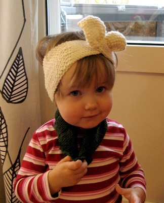 Aina oikein -neuleen lisäksi kaulaliinaan käyvät muut rullautumattomat neulepinnat, esimerkiksi helmineule tai joustinneule. Kuvassa lapsi käyttää valkoista helmineulekaulaliinaa luovasti pantana.