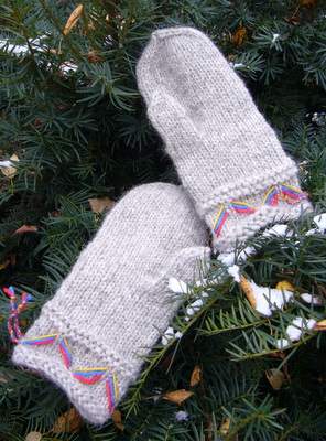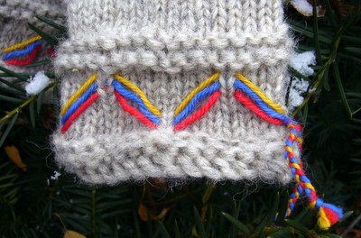 Suunnittele koristeet valitsemistasi jämälangoista. Voit etsiä internetistä koristelumalleja hakusanalla ”lovikka”, käyttäen esim. Googlen kuvahakua. Harmaiden lapasten koristelu on tehty viiden silmukkarivin yli, jolloin silmukat jakautuvat tasan. Aloita ja päätä koristelu lapasen kerroksenvaihtumiskohtaan (ulkosyrjälle) ja letitä lankojen päät yhteen kahdeksi palmikoksi. Tee letin päähän hevosenhäntäsolmu. Harjaa lopuksi lapaset ulko- ja sisäpuolelta (ei koristeen kohdalta) karkealla harjalla pehmeän karvaisiksi.