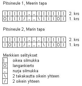 Neulo viisi kerrosta nurin ja aloita sitten kahden kerroksen pitsineule. Valitse joko alkuperäinen Meerin tapa ja tai siitä tehty muunnelma Marin tapa. Marin tavassa pitsineuleen reunat ovat symmetriset jalkapöydän päälle tulevassa osassa, koska pitsineule alkaa ja loppuu oikeaan silmukkaan.