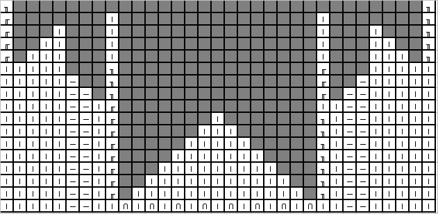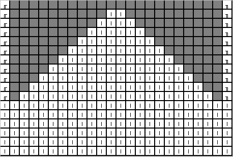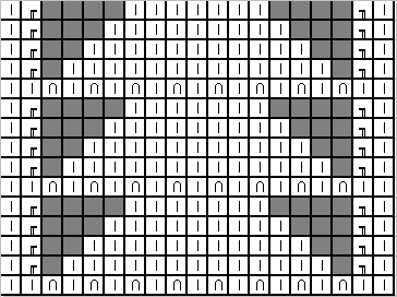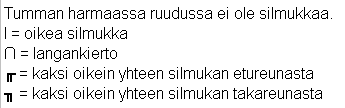 Kaaviossa on esitetty 11 silmukan kuvio. Kuvio jatkuu molempiin suuntiin joustinneuleena, joka alkaa 2 nurjalla silmukalla.
